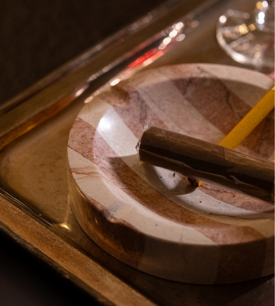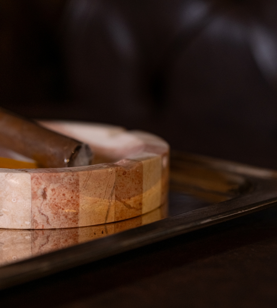 Bu pembe çizgili mermer kül tablası, sigara veya puro kullananlar için şık bir tamamlayıcı aksesuar olurken, aynı zamanda masanıza zarafet katacak bir tasarım objesi olarak da öne çıkıyor.