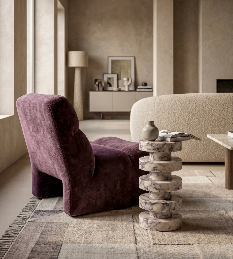 Dikey akış hissi veren bu yapı, ürünü yalnızca bir yan sehpa değil, aynı zamanda