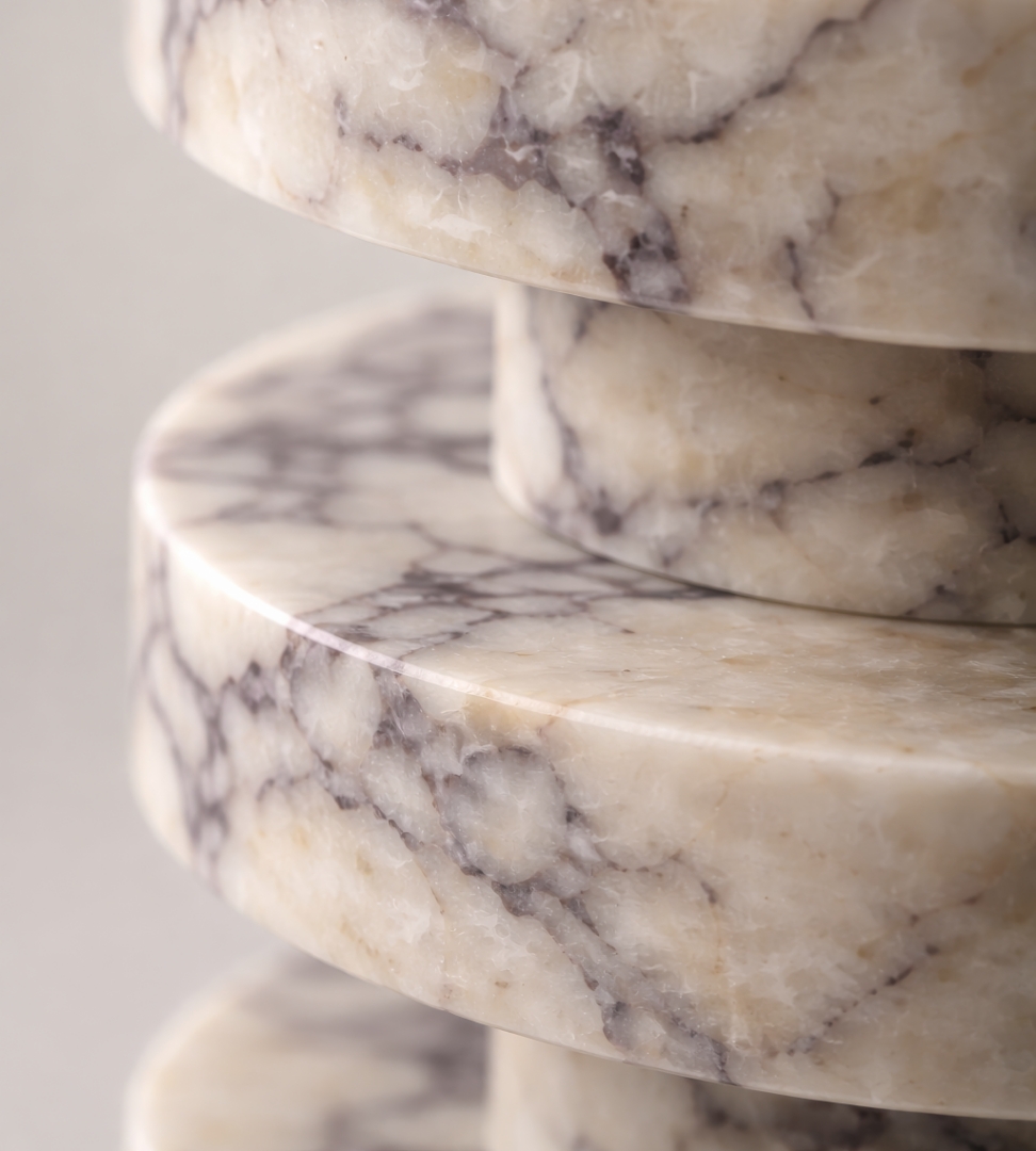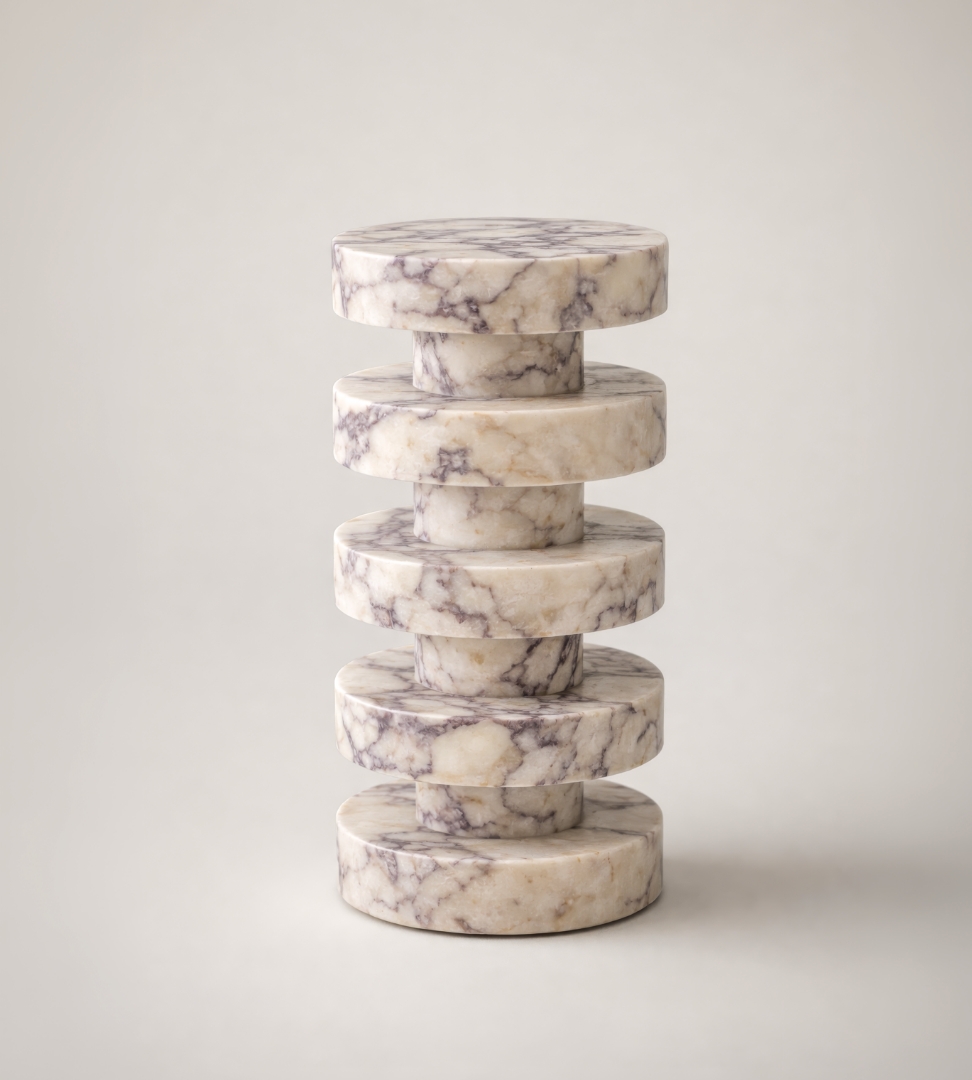 Rion Mermer Yan Sehpa, katmanlı disk formu ve doğal taşın özgün damar yapısını