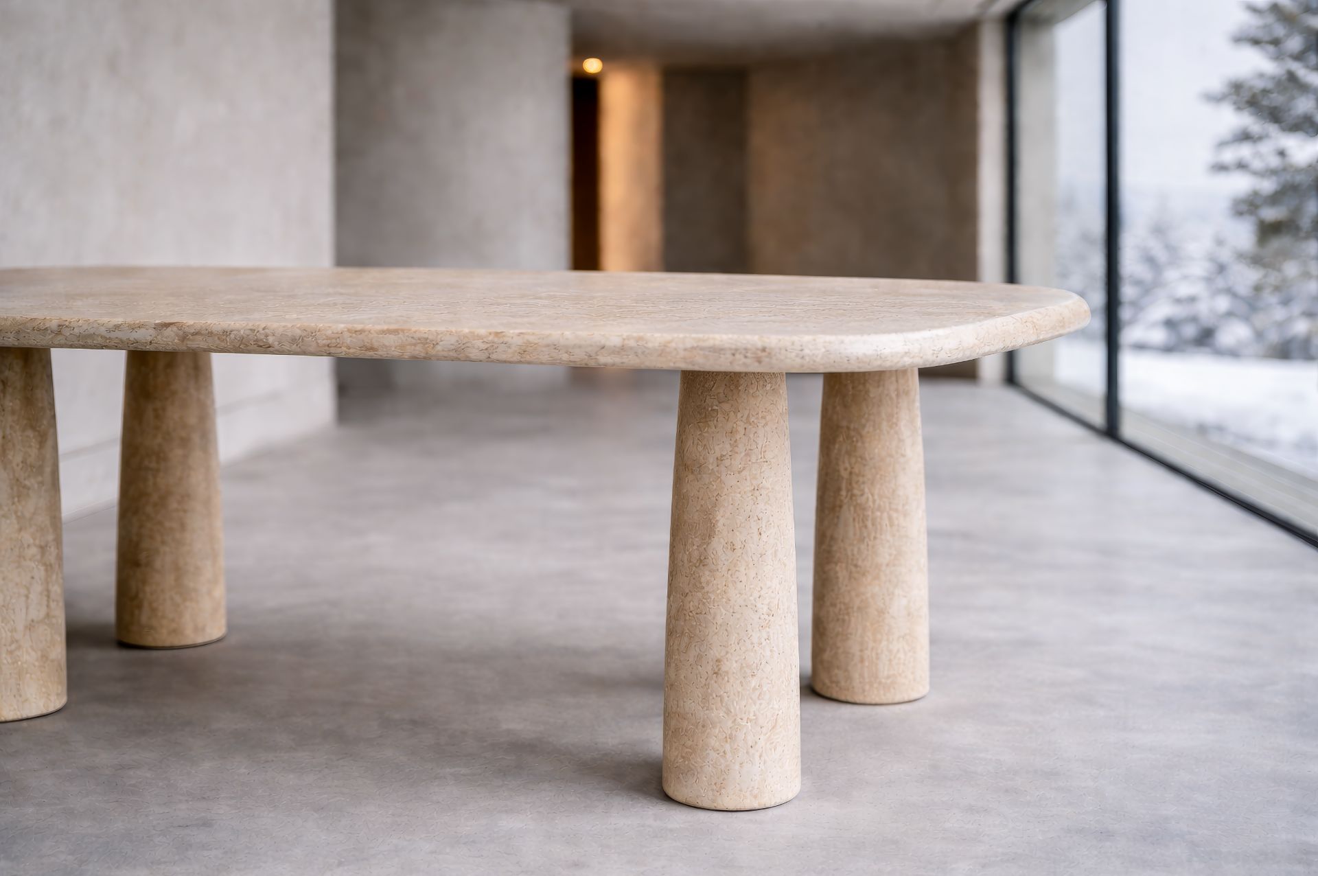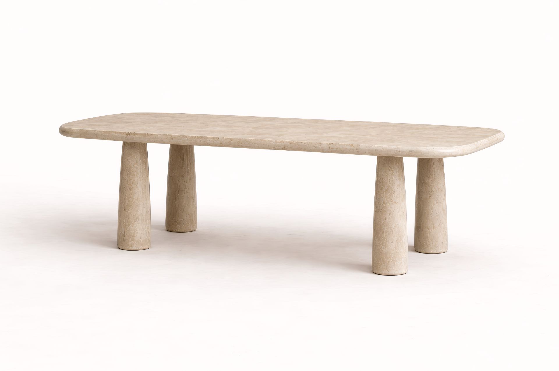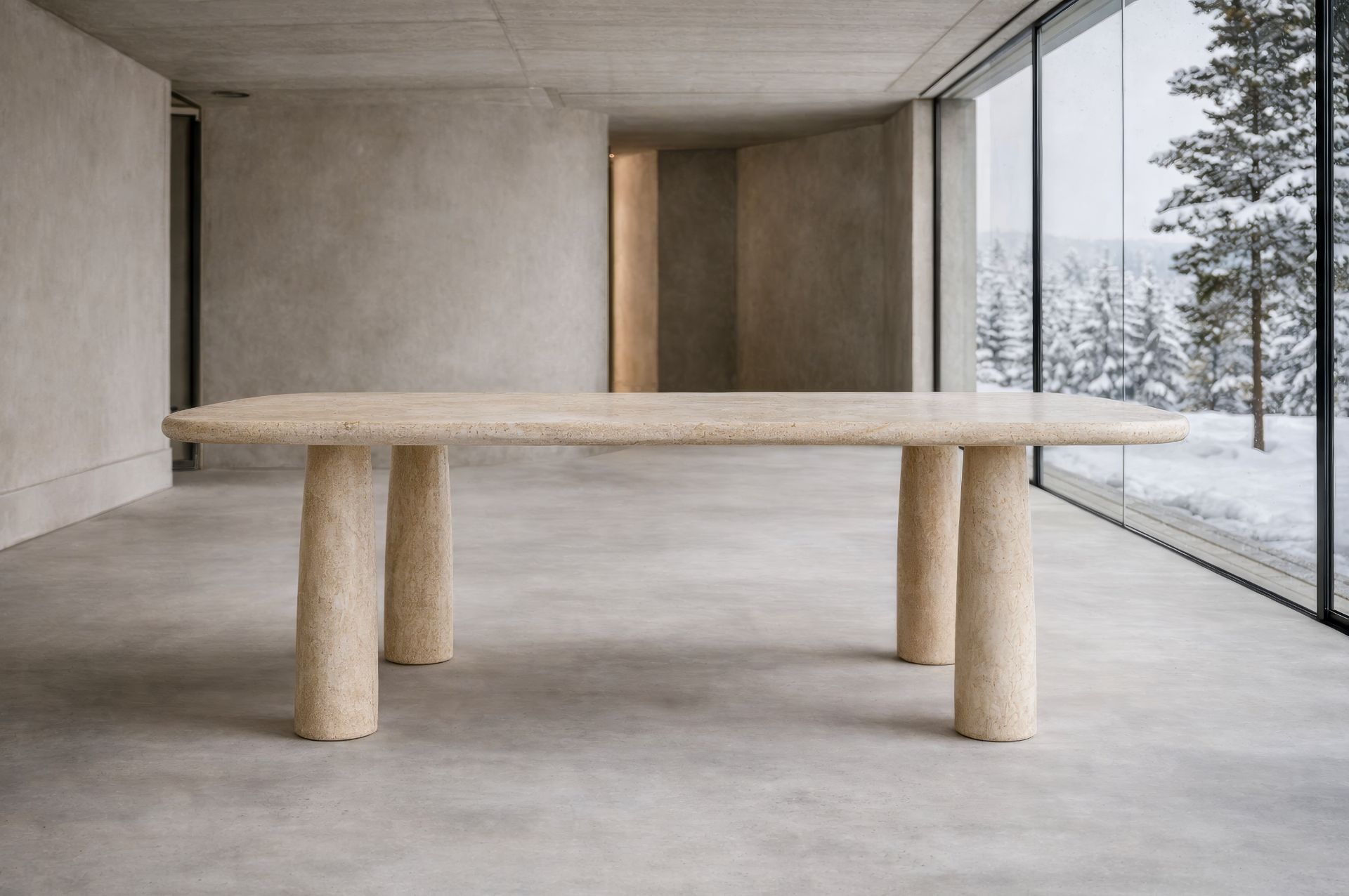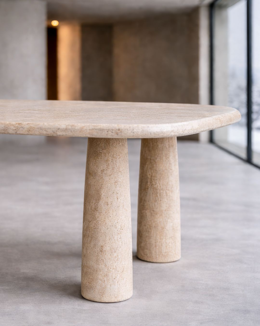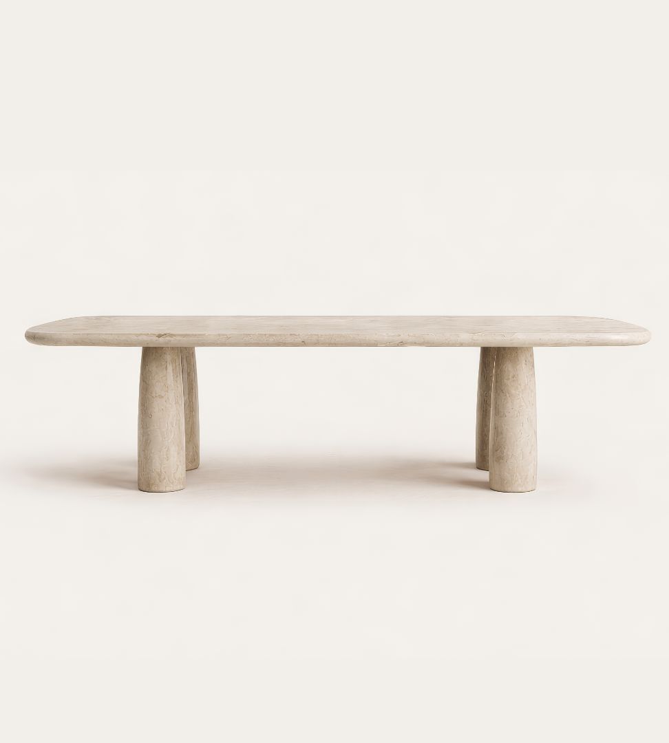 LYON Sofistike Traverten Yemek Masası, doğal taşın sakin gücünü uzun ve dengeli bir formda yaşam alanlarına taşır. %100 doğal travertenden üretilen bu masa, yalın tasarımı ve iki ayaklı taşıyıcı yapısıyla sofistike ve zamansız bir duruş sunar.