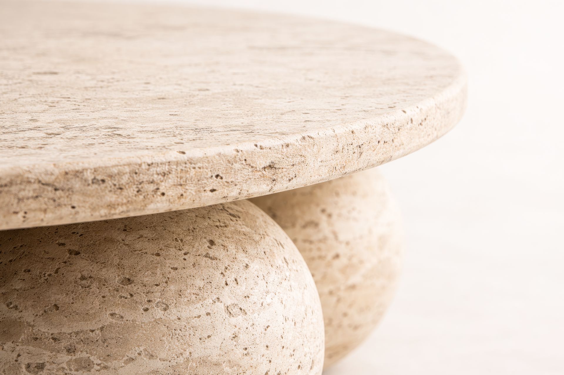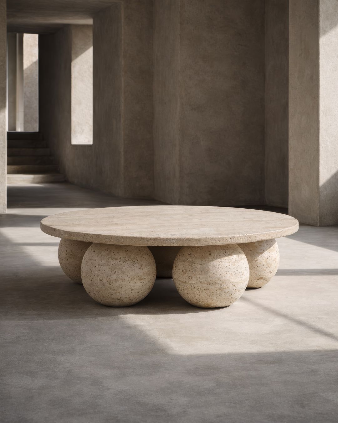 LUNEA Yuvarlak Traverten Orta Sehpa, dengeli oranları ve doğal taş kütlesiyle yaşam alanlarında güçlü bir duruş sunacak şekilde tasarlanmıştır.